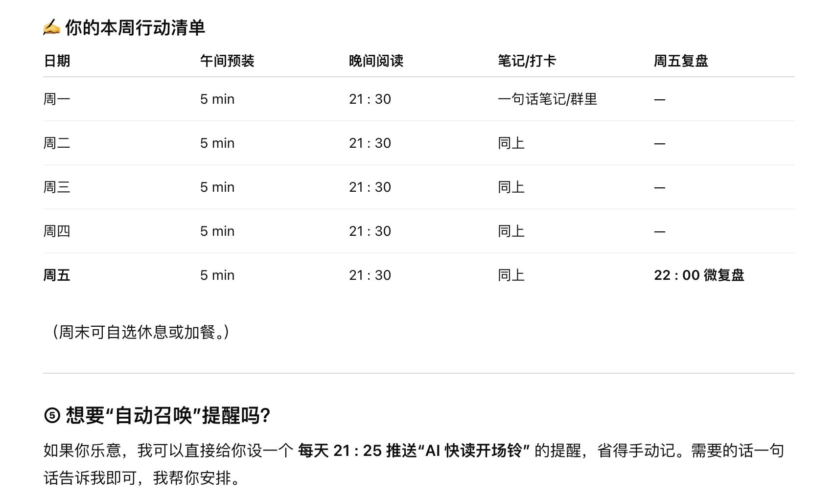 借助它的引导,我找到了核心障碍;我们一起确认了最有可能不被打扰的时间,并制定了具体的计划表。除了时间上做出切实可行的规划外,GPT 还分享了“外部承诺+快反馈”的持续行动方法,并帮我设置了相应的提醒任务。整个复盘过程非常流畅,这实际上就是非常高效的一个 GTD(Get Things Done)体验。