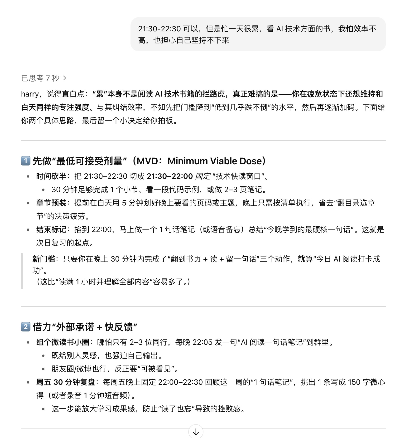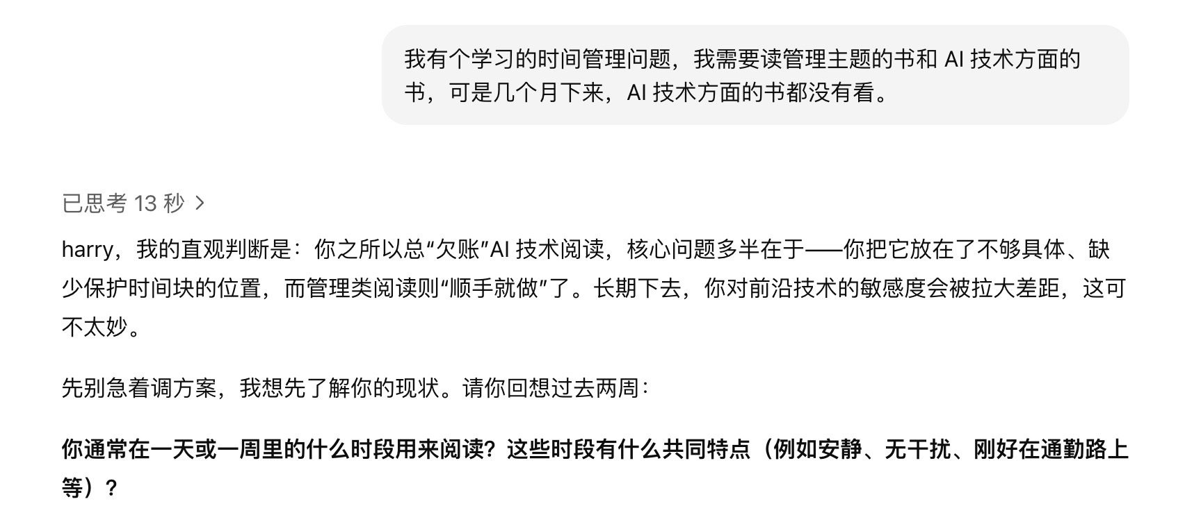 以我自己的经历为例:昨天在做月度复盘时,我发现有两本计划已久的 AI 主题书籍已经拖欠了两个月。虽说我可以找出很多原因来解释为什么没看,但其实我知道,真正的原因并不在那些表面理由上,只是一直在逃避深入梳理。而这种逃避,反而让我更加焦虑。于是,我尝试用 ChatGPT 的学习模式,把自己的困扰告诉了它。它不仅准确抓住了问题的本质,顺势抛出关键问题,引导我主动反思。这种对话就像是在复盘中“深挖原因”,而且效果比自己和自己对话要好许多。