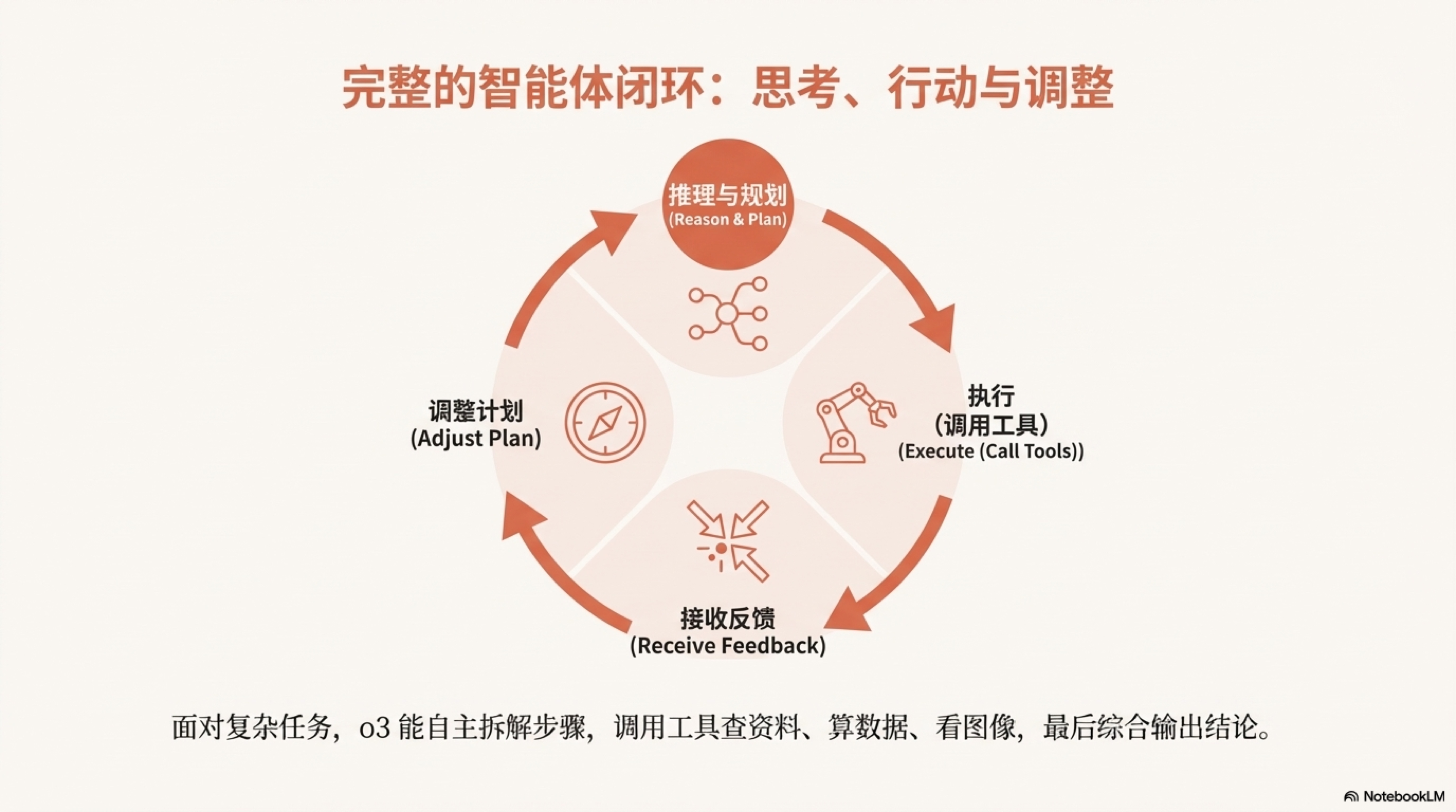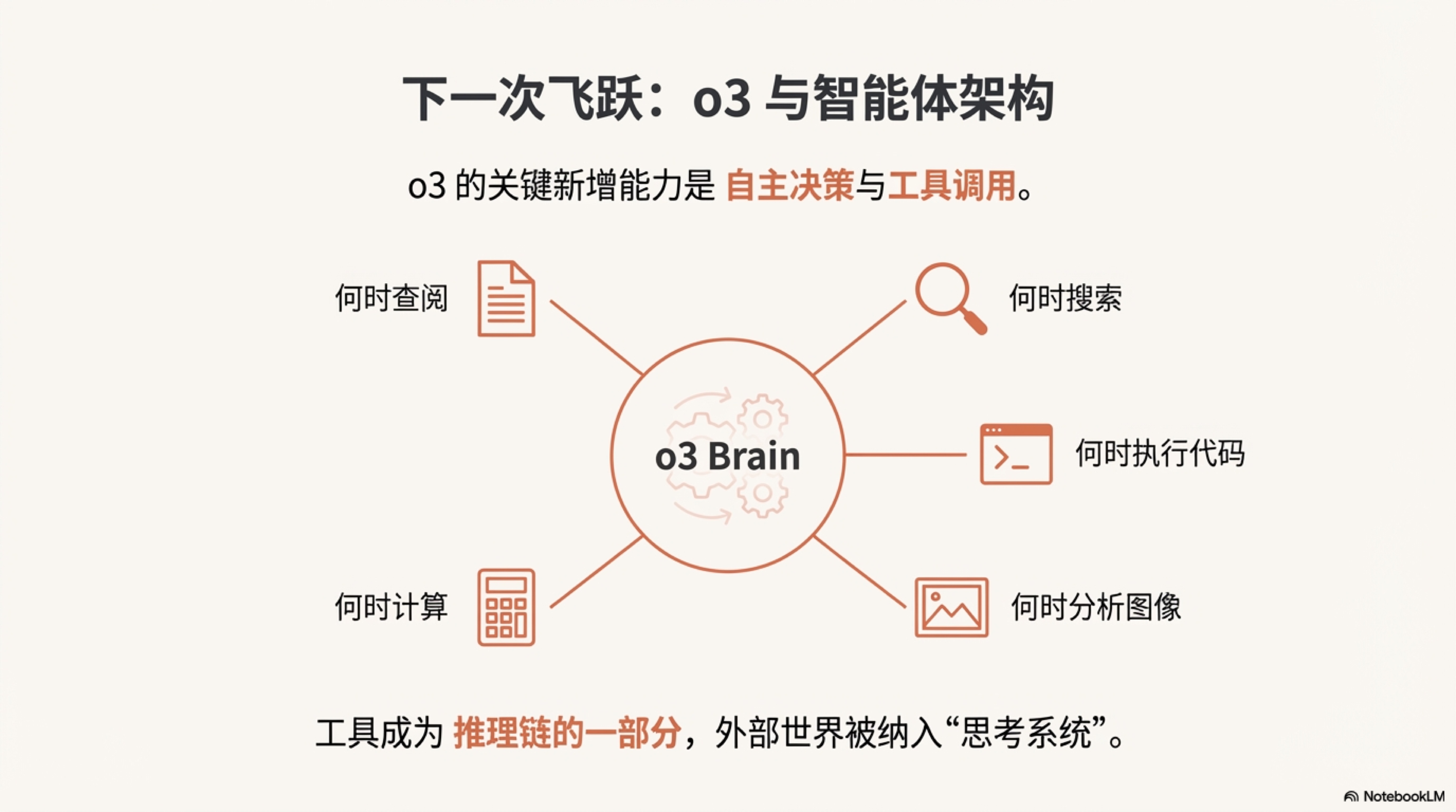 OpenAI 的 o1 和 o3 模型展现了推理模型的两次飞跃。o1证明了AI可以通过延长思考链条获得惊人的解题能力,而o3则更进一步,让AI具备了类似 智能体(agent) 的特质,能够自主规划并调用工具来完成复杂任务。
