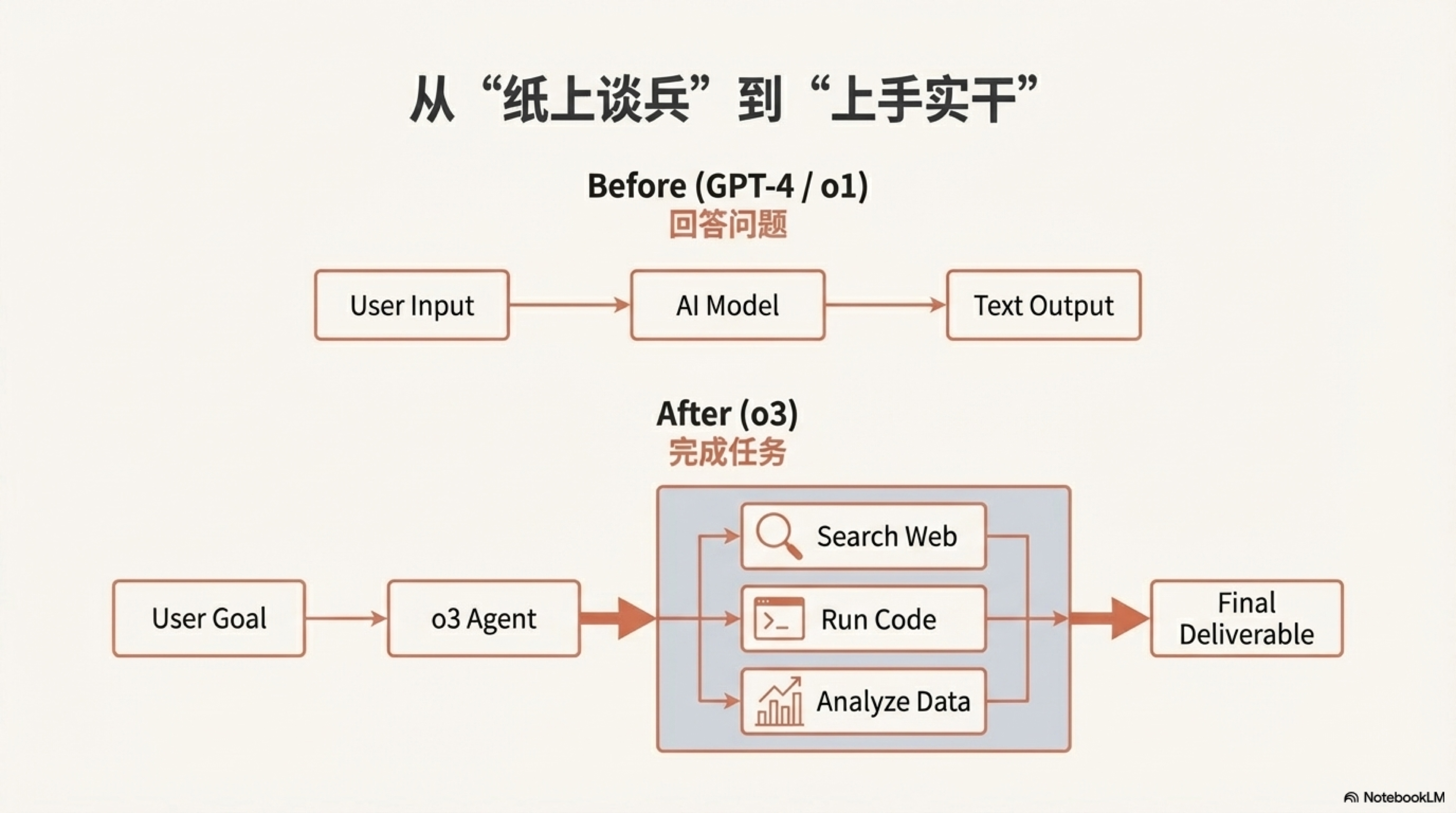o3 标志着推理模型从“纸上谈兵”进化到了“上手实干”。它兼具深度思考和动手能力:既能利用自身的CoT链条进行严谨推理,又能通过工具获取新知、执行操作。这正是迈向通用人工智能代理的重要一步——模型不只是被动回答问题,而是可以主动为你完成复杂任务。
