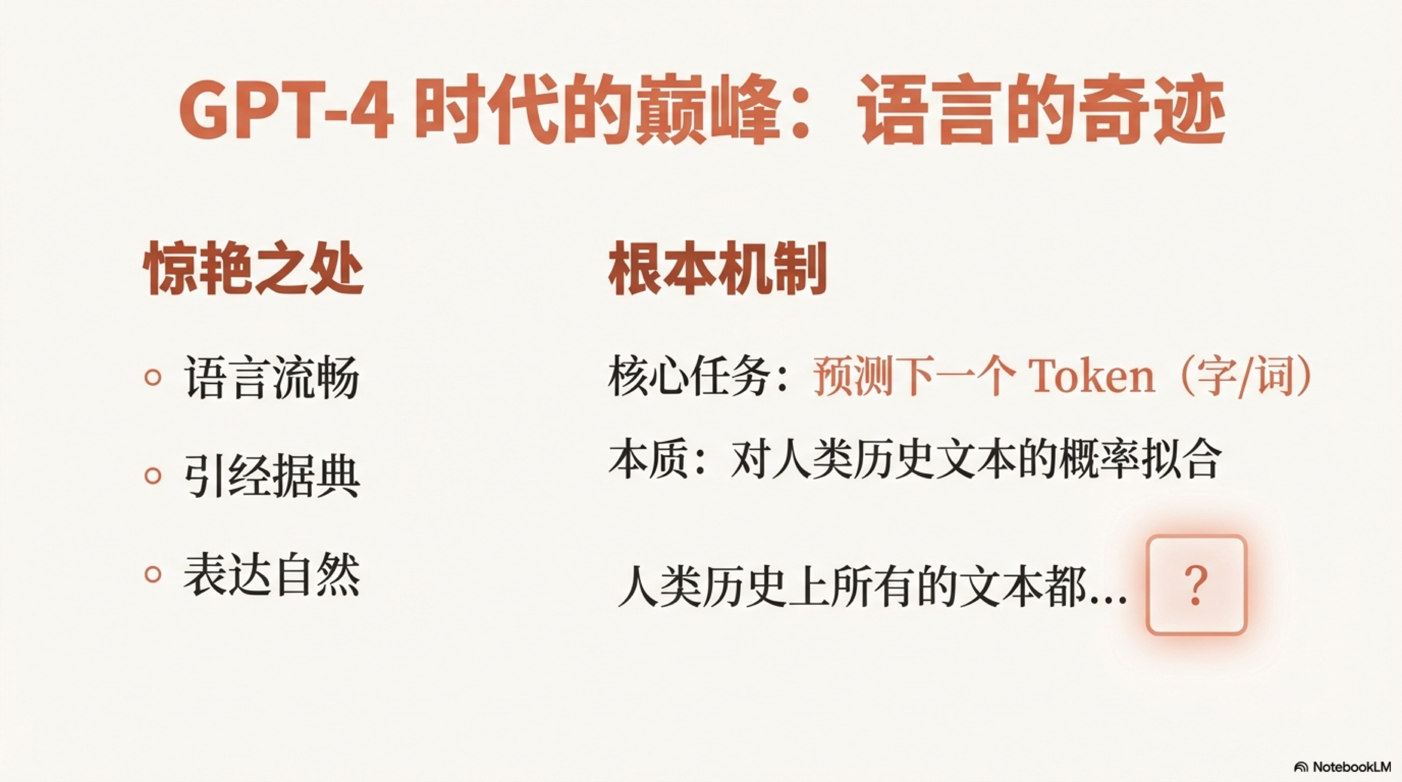 在过去几年里,我们被 GPT-4 这样的大语言模型惊艳,是因为它们说话太漂亮了。它们就像一个博览群书的文科生,能够引经据典,流畅地回答你的问题。但如果你仔细观察,你会发现它们有时在“胡说八道”。因为本质上,传统的大语言模型(LLM) 只是在做一件事:预测下一个 token(字/词)。它是基于概率的统计学奇迹,是对人类过往文本的模仿。