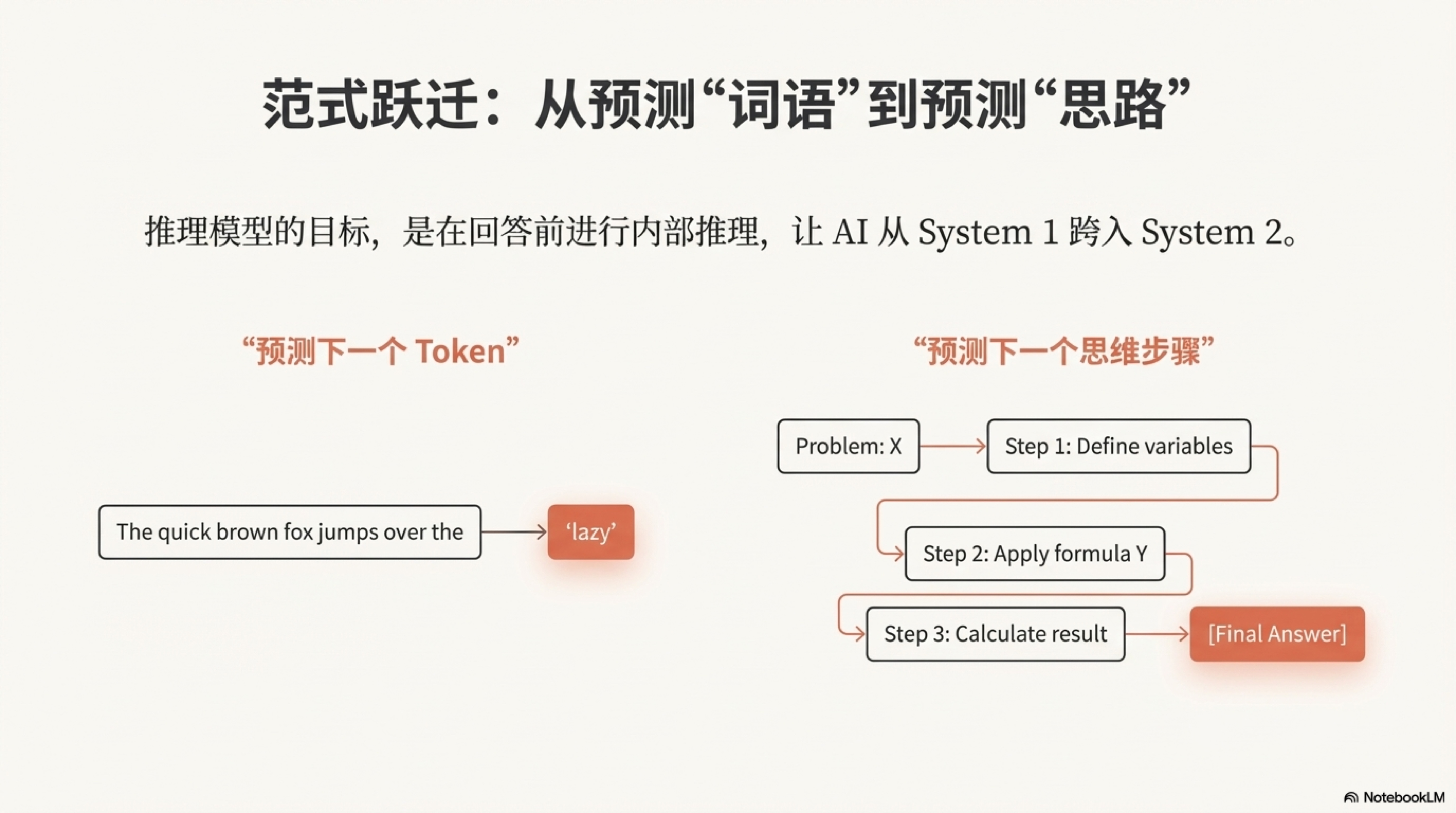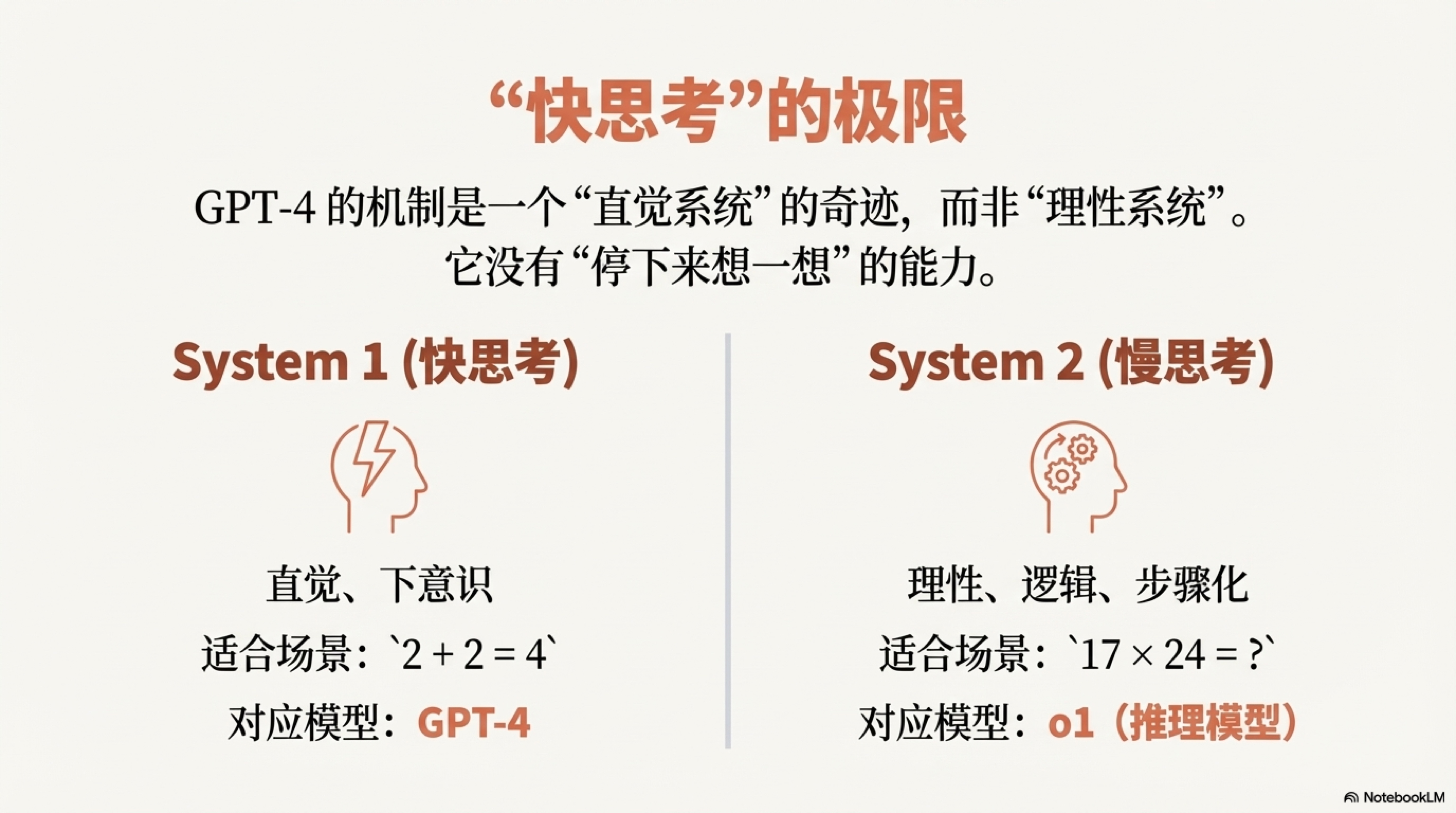 如果把之前的 LLM 比作人类的“直觉”(System 1,快思考),那么推理模型就是在试图构建人类的“理性”(System 2,慢思考)。