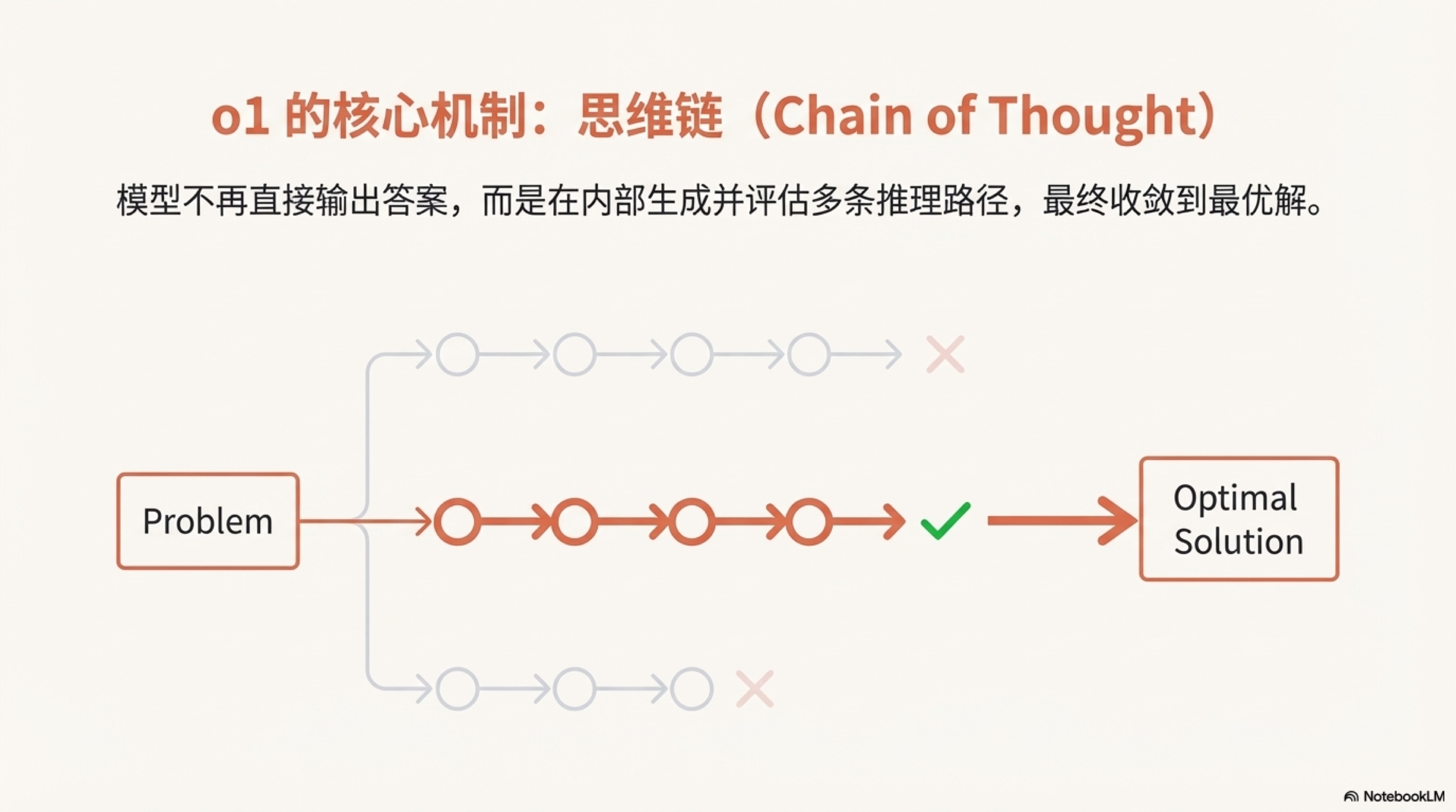 o1的突破,正是让AI从”系统1”跨入了”系统2”。它不再只是预测下一个token,而是预测下一个思维步骤。在给出答案之前,它会在内部展开一条”思维链”(Chain of Thought),尝试多种路径,评估各种可能,最终收敛到最优解。