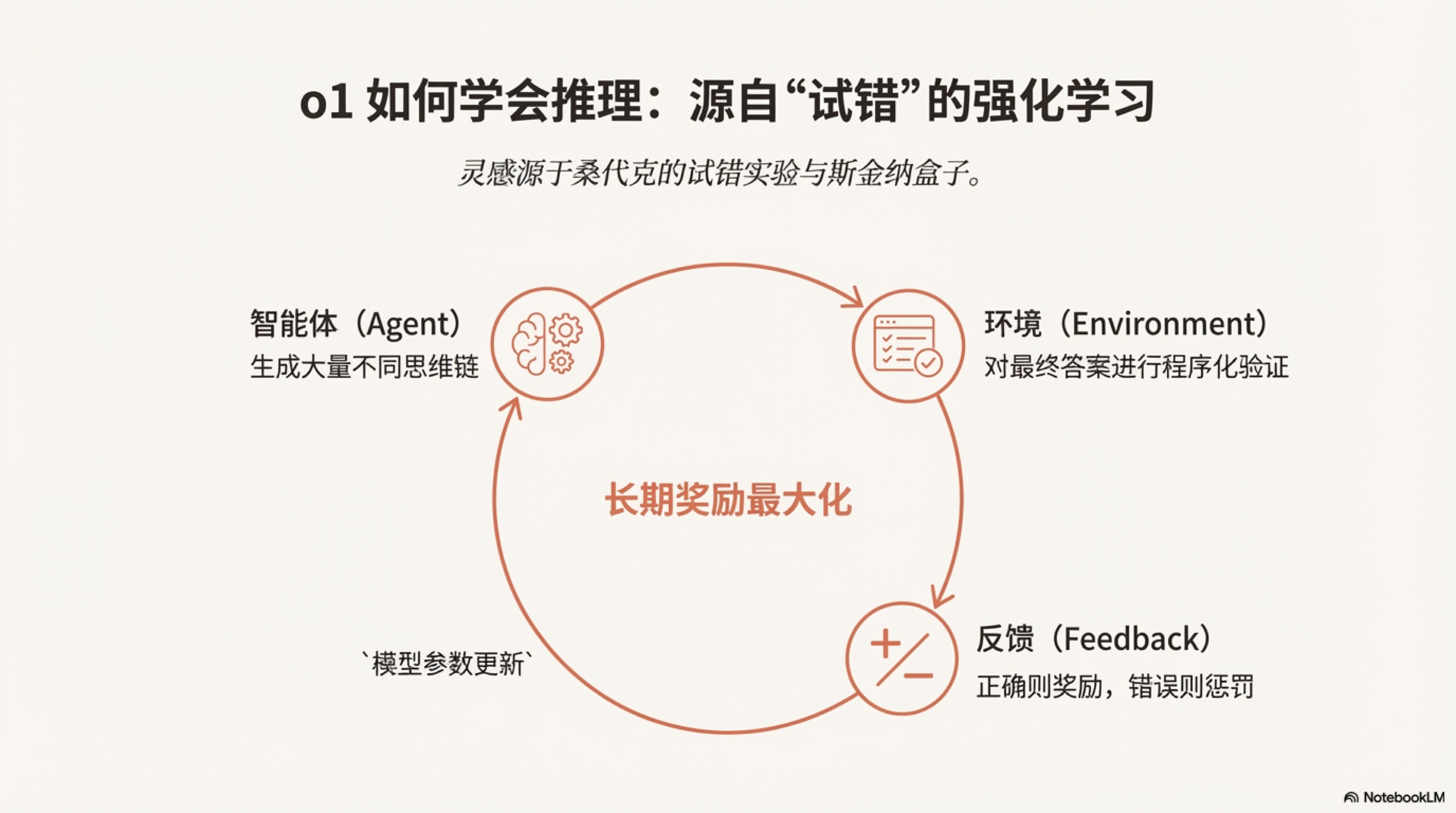 推理模型背后的关键技术之一是强化学习(Reinforcement Learning)。不同于一次性学习固定模式,强化学习让模型通过与环境反复交互、不断试错来逐步改进策略。这一思想可以追溯到一个多世纪前心理学家的动物实验:美国心理学家爱德华·桑代克(Edward Thorndike)曾把饥饿的猫关在“迷箱”里,猫需要摸索按下某个杆才能逃出进食。实验发现,猫完全是靠反复试验和错误才学会如何逃脱——每次碰巧按对杆就得到食物奖励,错误尝试则渐渐被淘汰。后来行为学家B.F.斯金纳(B.F. Skinner)发明了著名的斯金纳箱([[斯金纳盒子 skinner box]]),让动物通过按杆获取食物或避免噪音惩罚,进一步验证了奖赏会强化行为、惩罚会抑制行为的原理。这些实验揭示出的“试错学习”机制,正是强化学习算法的灵感来源。