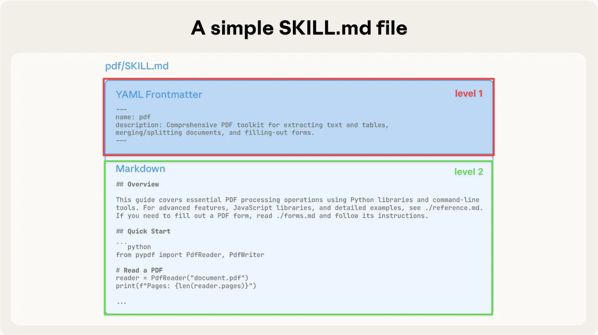 Level 2:SKILL.md 的实际内容—— 完整的技能说明(< 5k tokens)