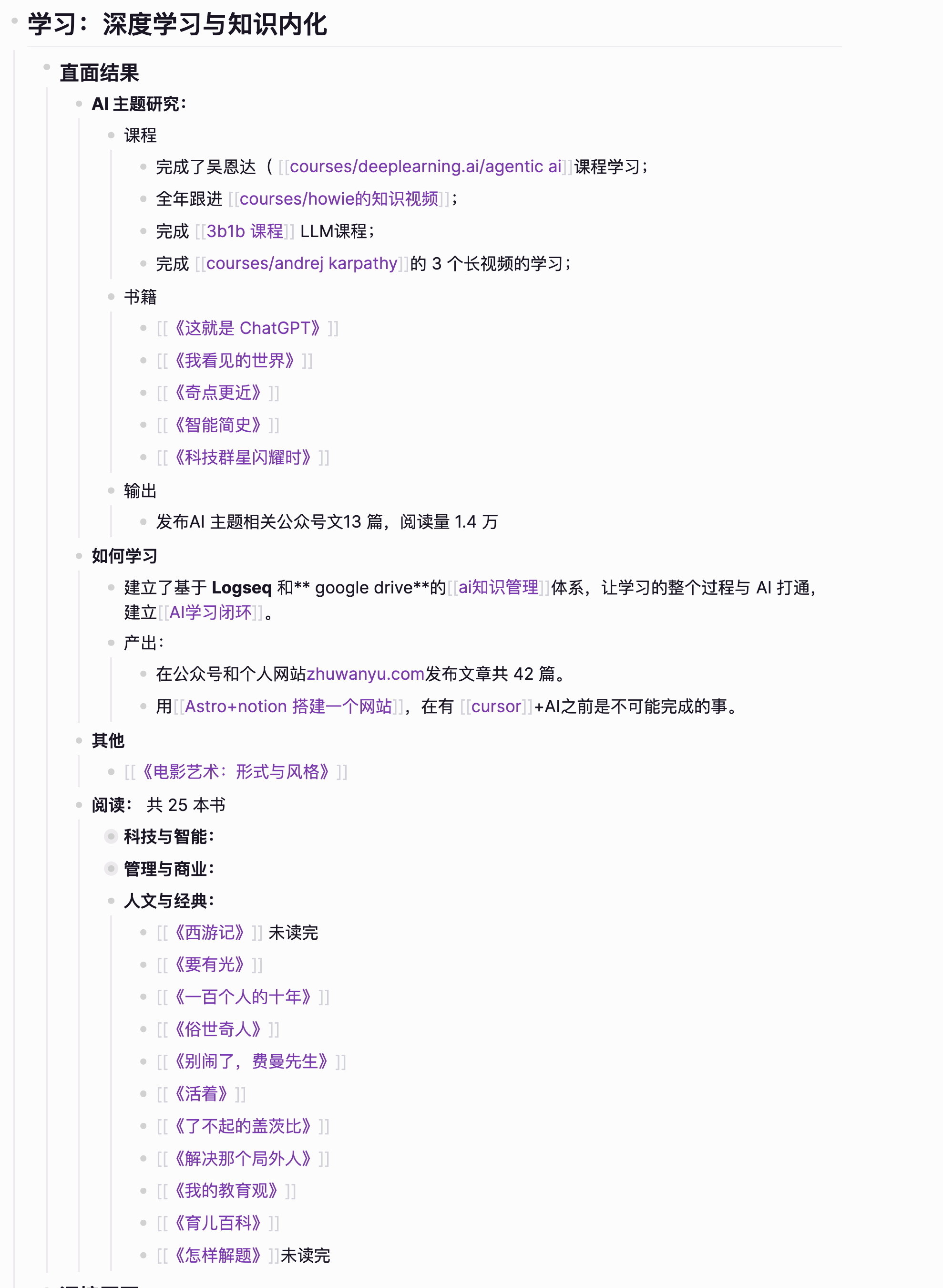 以往,通过手动整理这些信息,我需要在文档之间来回跳转,这种摩擦力往往消耗了大部分的时间和精力,导致复盘一开始就力不从心。但是有了 AI+logseq,数据整理变得不再痛苦。