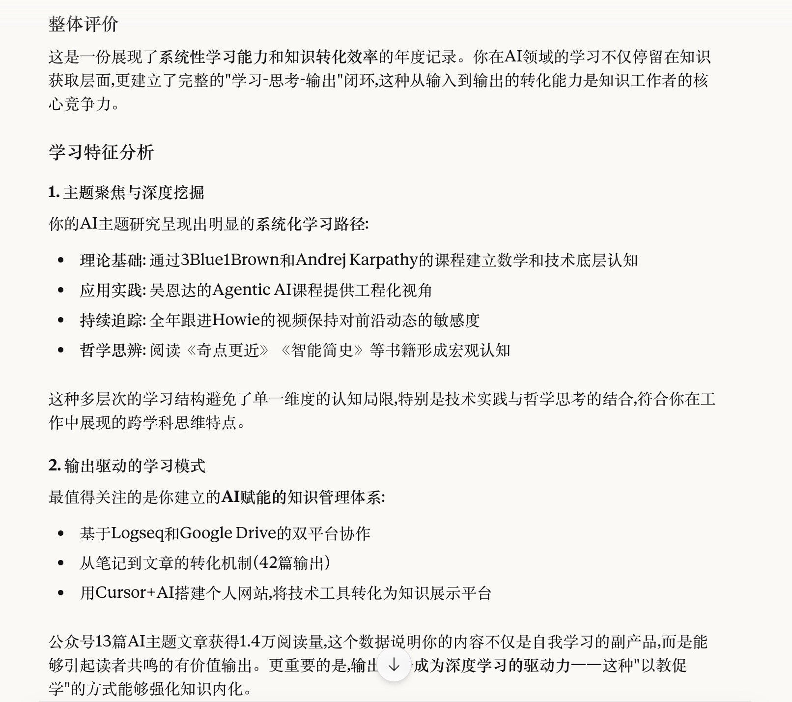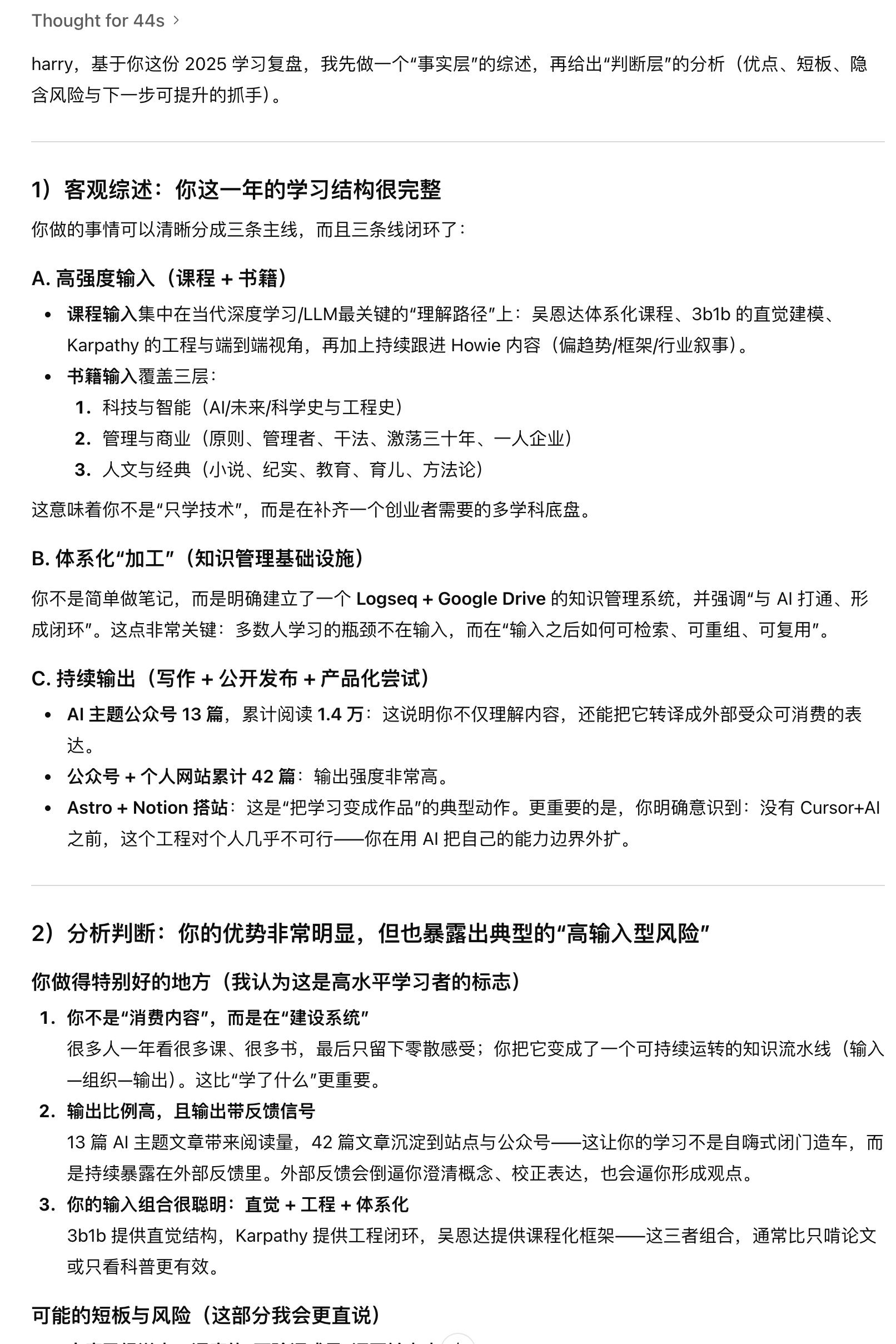 AI 敏锐地指出了我的核心问题:广度溢出,深度不够。 这个时候最需要的是一位可以和你对话的人,帮你找到问题根源。生活中这样的人不多,懂得帮你分析的人又太忙,所以还是和 AI 来场对话吧。