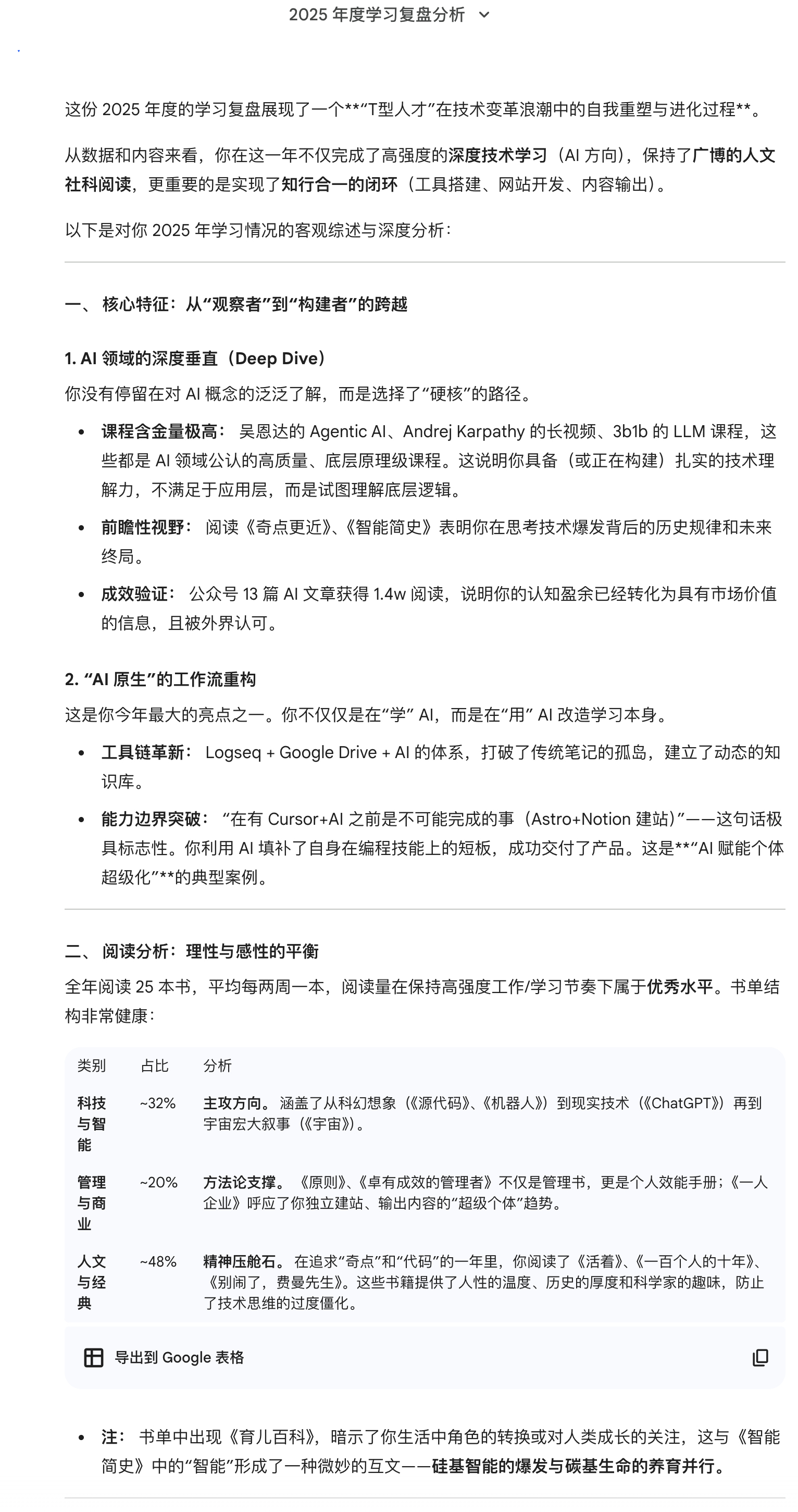 Gemini 注意到了一个细节。它在分析我的书单时还发现了我在读《育儿百科》,这说明 AI 不仅和我有关,也和组建一个学习型家庭有关。