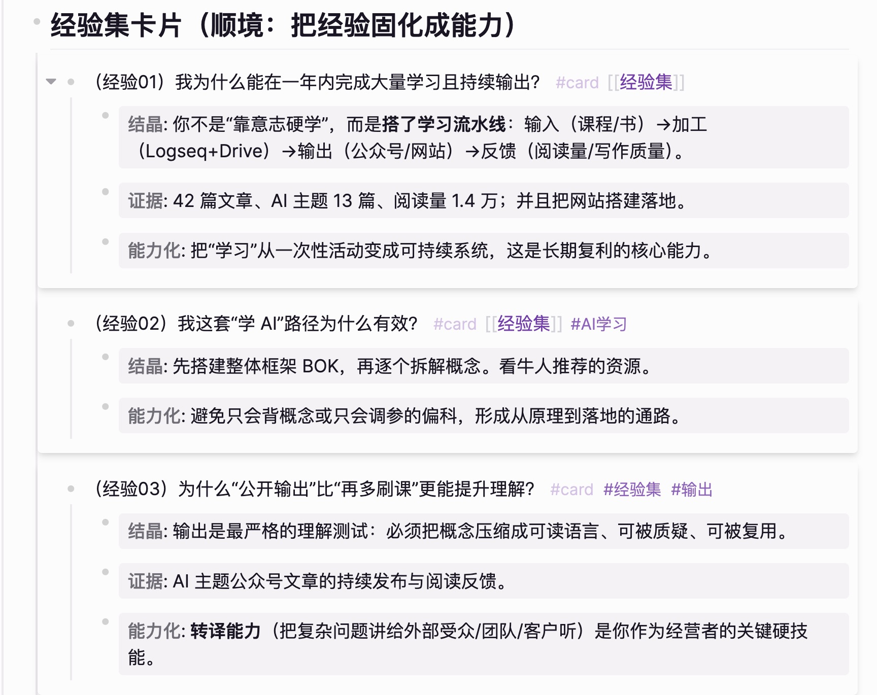 经验集卡片:记录那些在顺境中被验证的方法论。