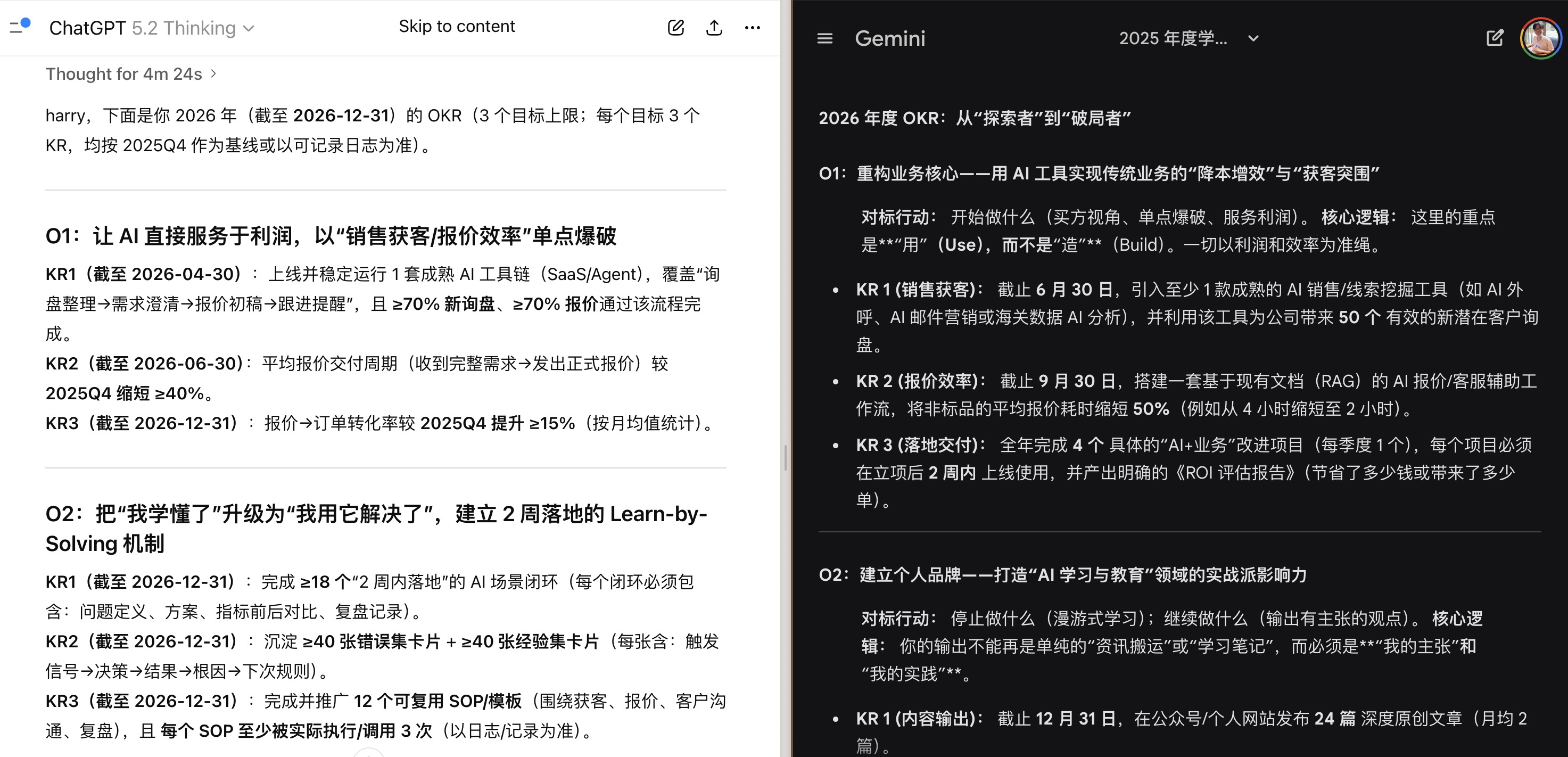 在以上对话的基础上进行修改,补充上自己认为下一年里最重要的事情,然后让 AI 拟定 2026 年的 OKR。依据 SMART 原则,目标被限制在 3 个以内。
