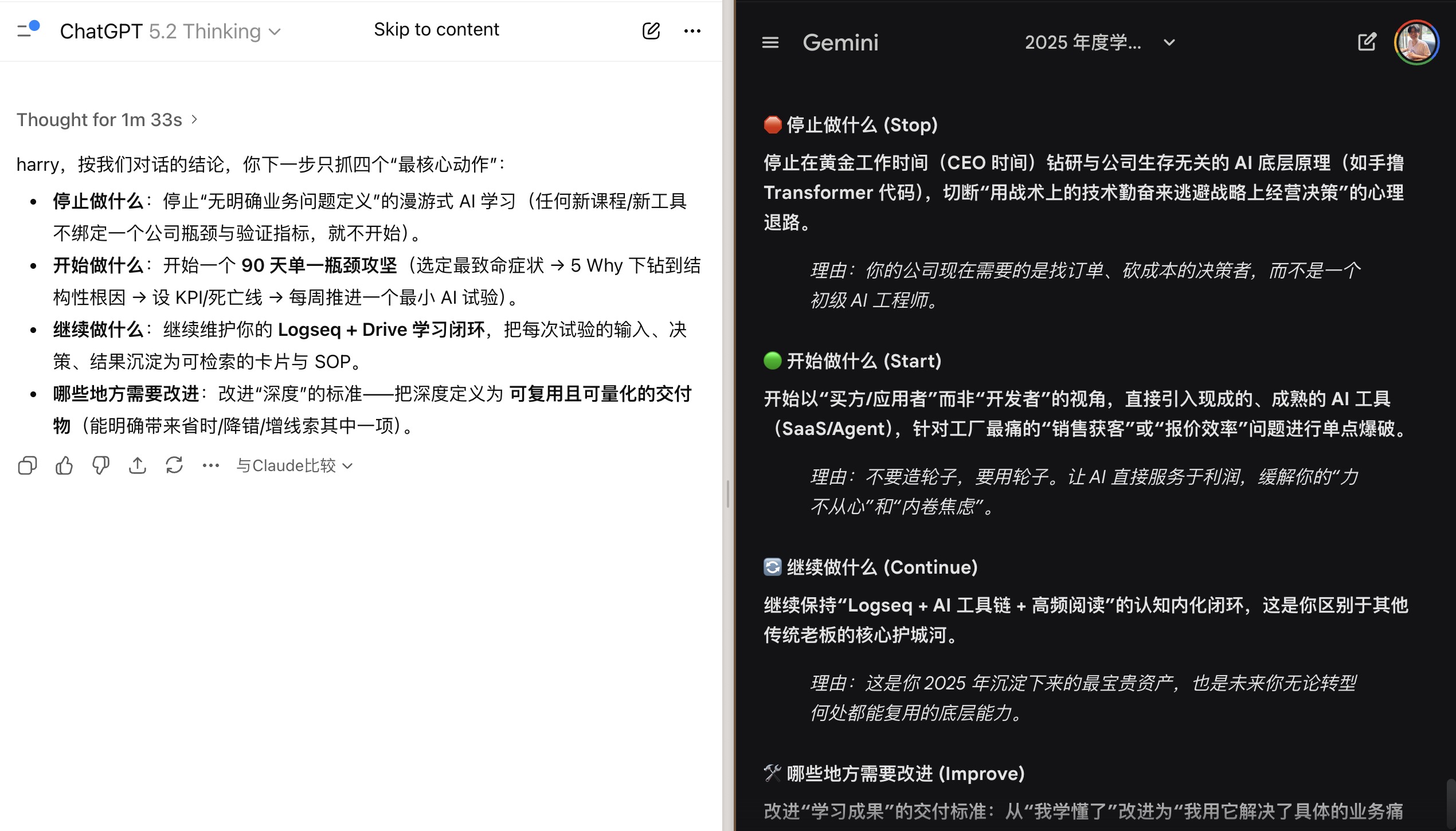 我采用了一种“三方会谈”的策略。我将 Logseq 中的大纲同时投喂给 ChatGPT、Gemini 和 Claude,要求它们进行“客观、公正的综述和分析”。