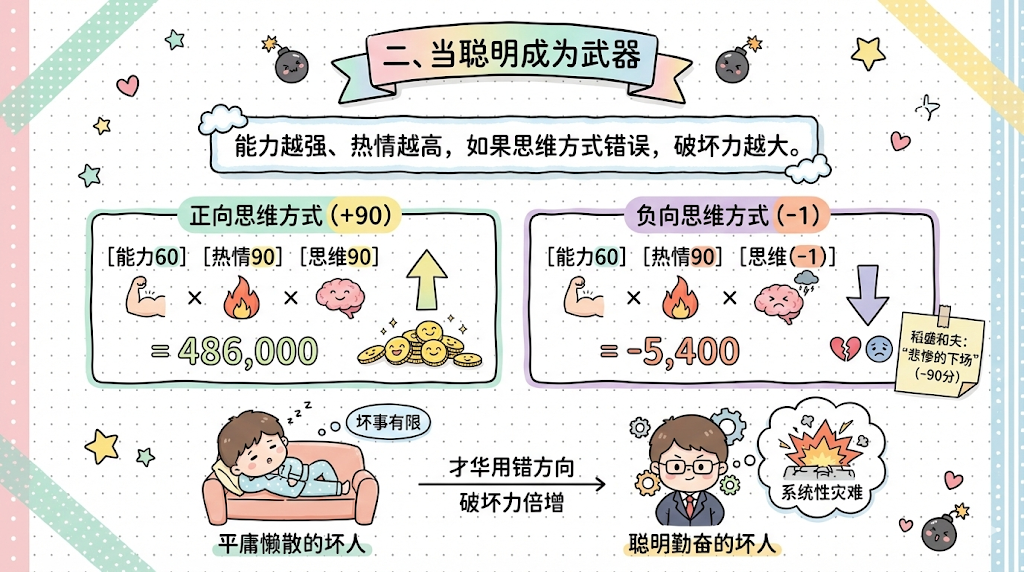 这就是为什么历史上那些造成巨大灾难的人,往往不是无能之辈,而是极度聪明、极度勤奋、但心术不正的人。他们把所有的才华和精力都用在了错误的方向上。