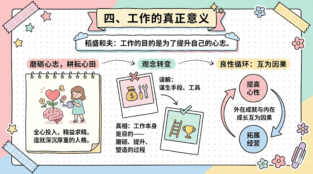 这颠覆了大多数人对工作的理解。我们习惯把工作当作谋生手段,当作实现某个外在目标的工具。但稻盛和夫说,工作本身就是目的——它是磨砺你、提升你、塑造你的过程。