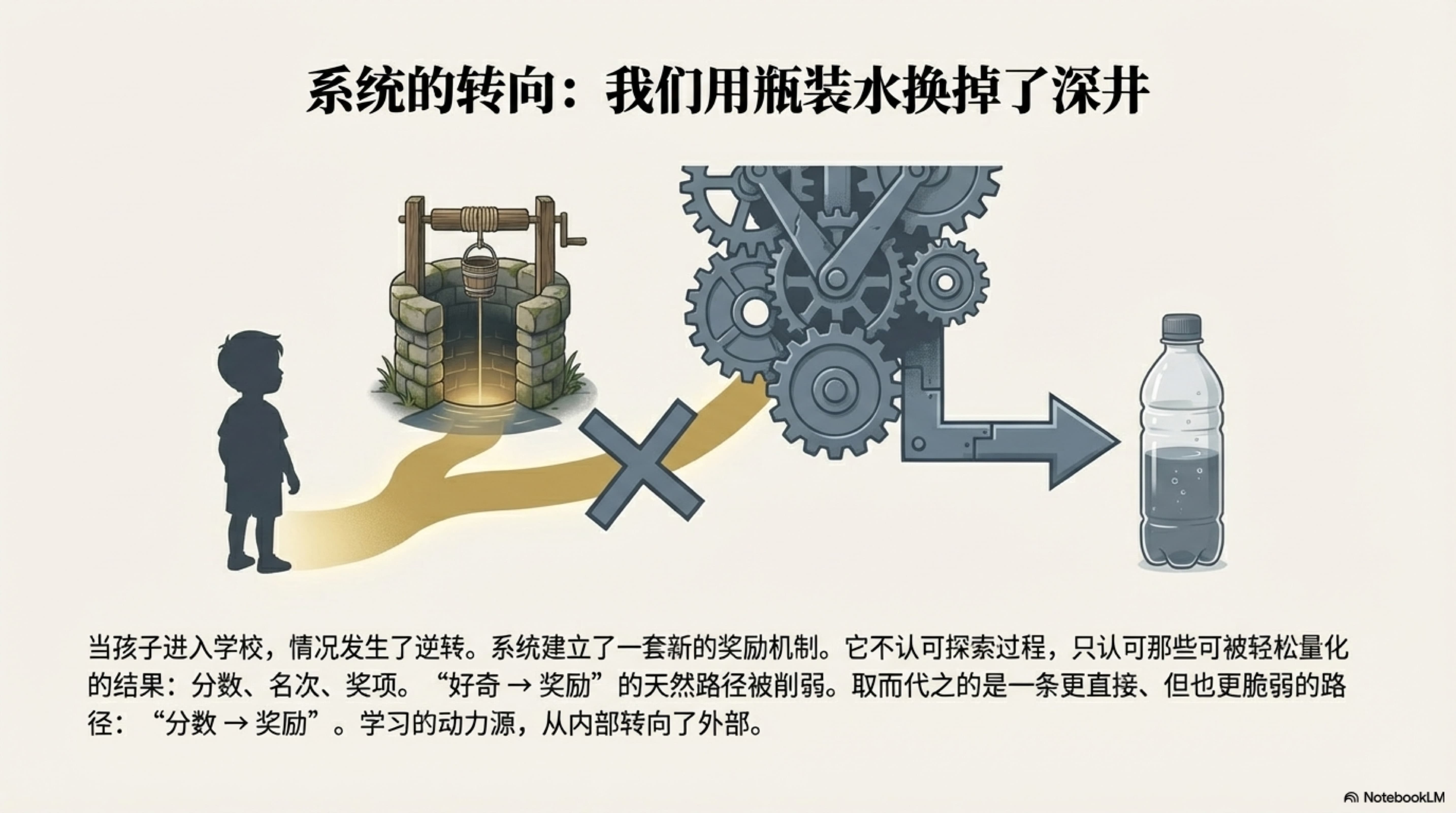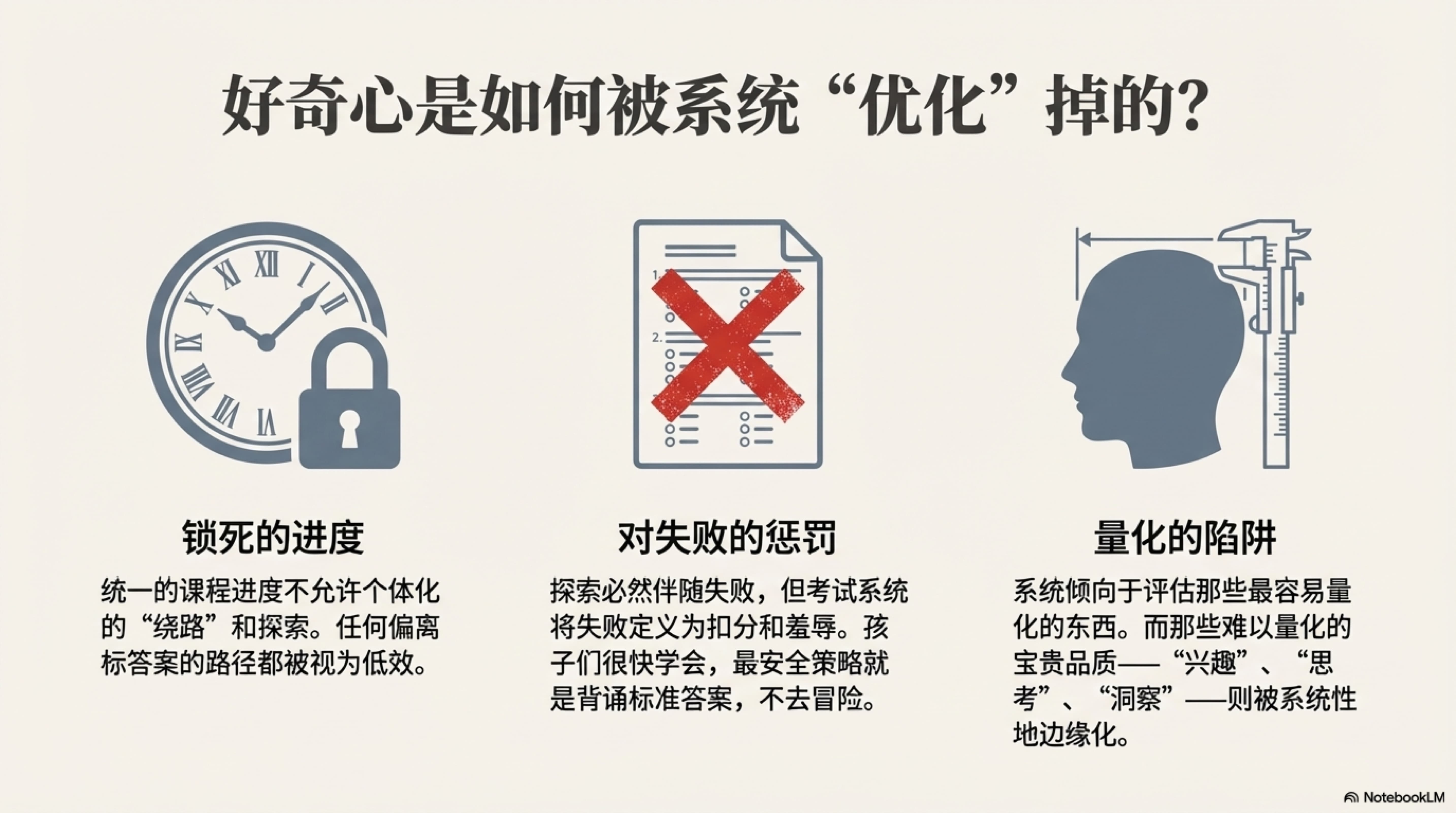 好奇心需要“发呆”,需要“绕路”。但学校的进度条是锁死的。全班必须在 45 分钟内学完这一章。当一个孩子的思绪飘向“为什么天空是蓝的”这种课标之外的问题时,老师只能把他拉回来。因为系统没有时间给他探索。
