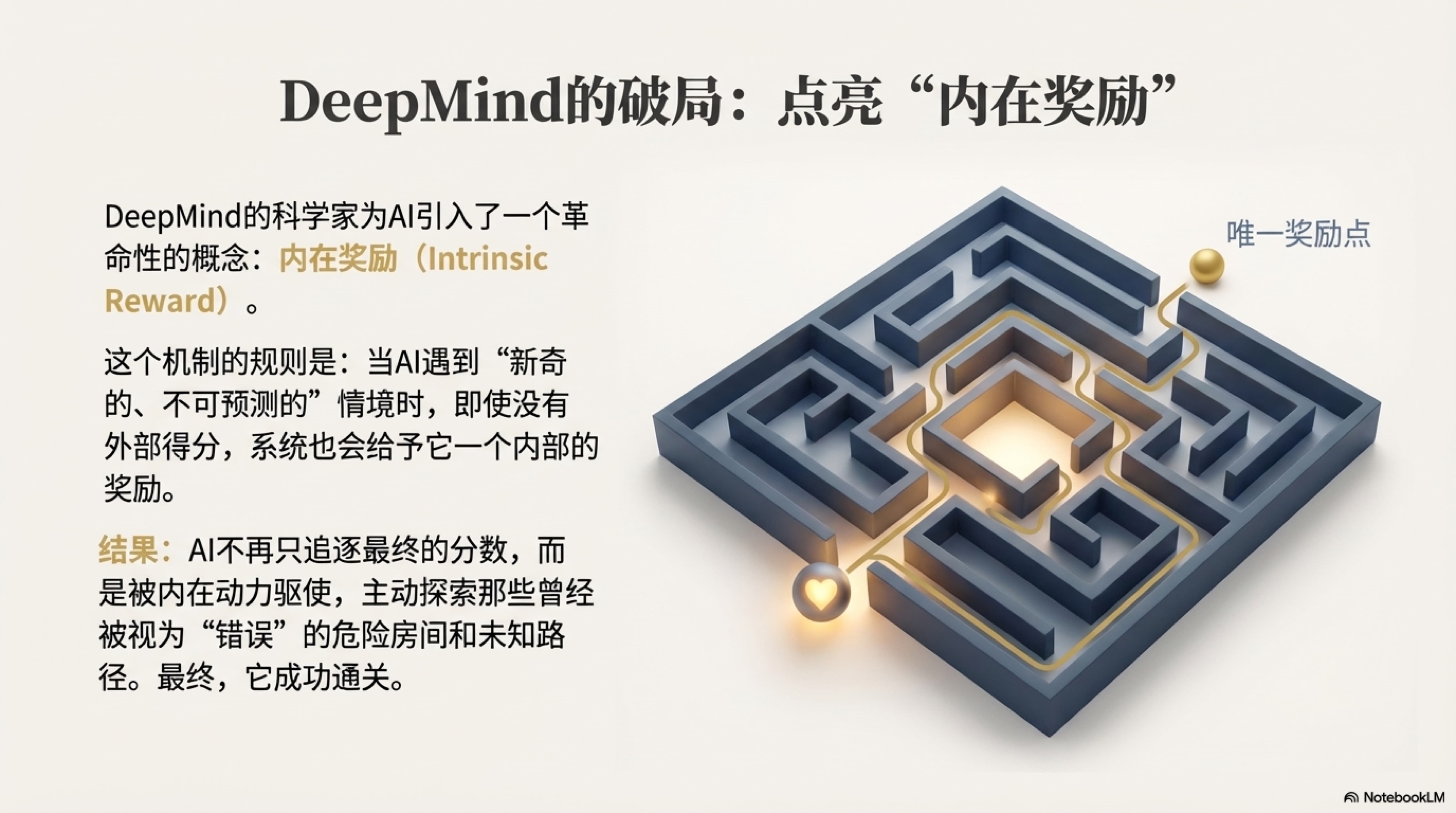 直到 2018 年,DeepMind 做了一个改变。他们不再只给 AI 喂食“分数”,而是加入了一个人类才有的古老机制——好奇心。