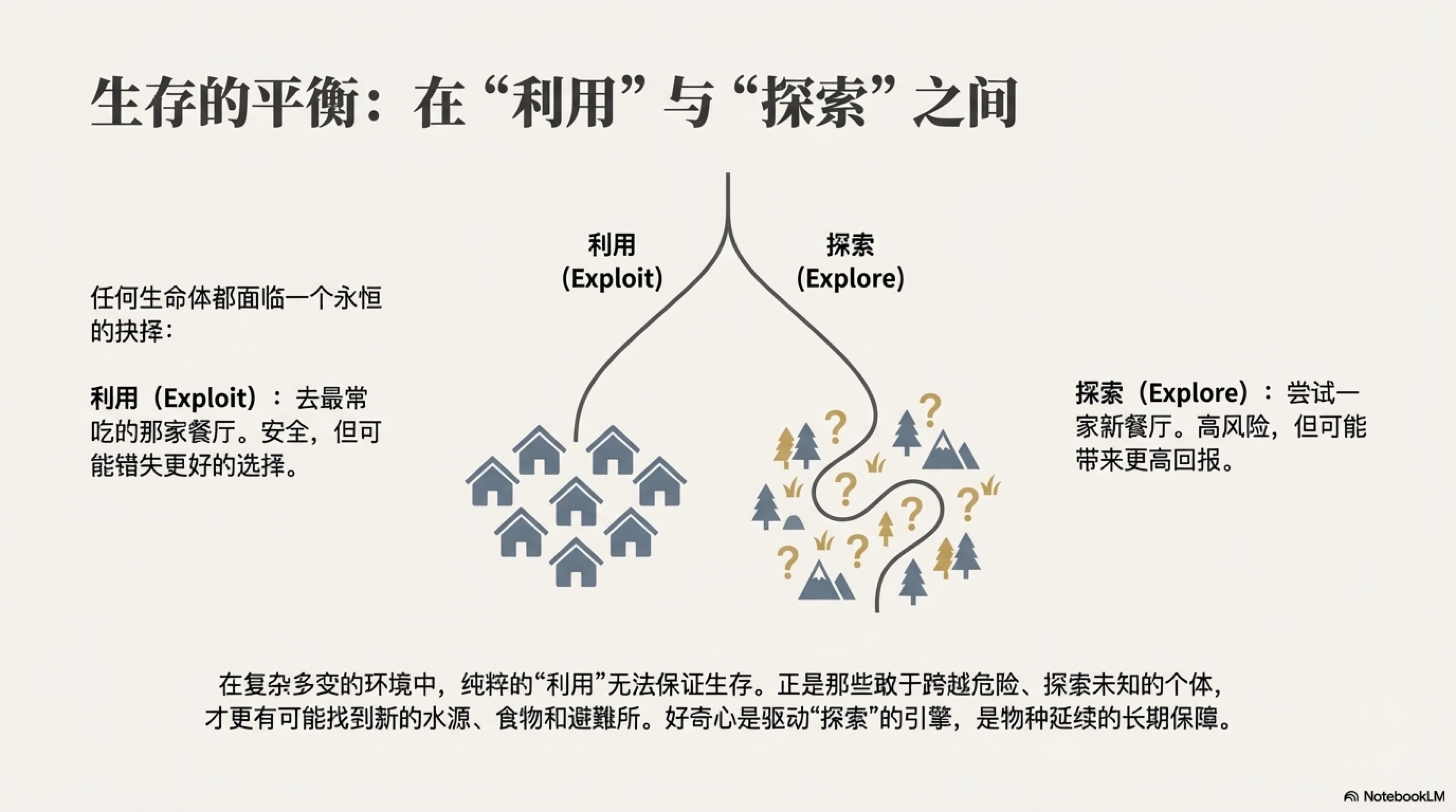 比如,你要去一家你最喜欢的餐厅吃饭(利用,Exploit),还是去一家新开的、可能很难吃也可能很惊艳的餐厅(探索,Explore)?如果你永远只“利用”,你的生活是安全的,但你永远发现不了更好的东西;如果你永远在“探索”,你可能会饿死。