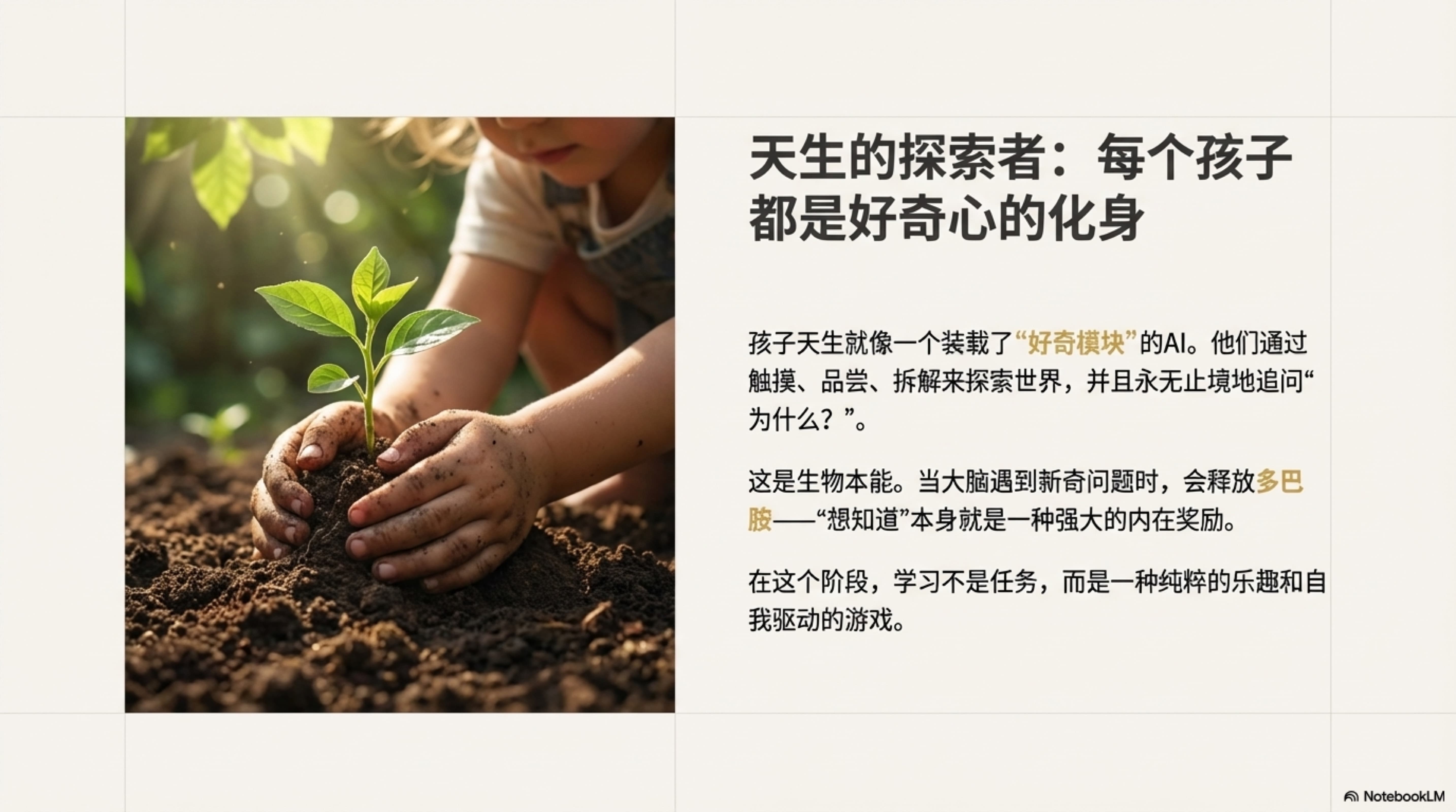 孩子天生充满好奇——好奇心是学习最原始的驱动力。如果你观察过 3 岁的孩子,你会发现他们就是那个装载了“好奇心模块”的 AI,不知疲倦地探索房间。他们对一切问题都想问“为什么?”。他们对世界的一切都饶有兴趣。然而,许多孩子在进入学校几年后,那股探索欲却逐渐消退了。他们开始变得不再提问,学习变成了一种任务而非乐趣。为什么会这样?