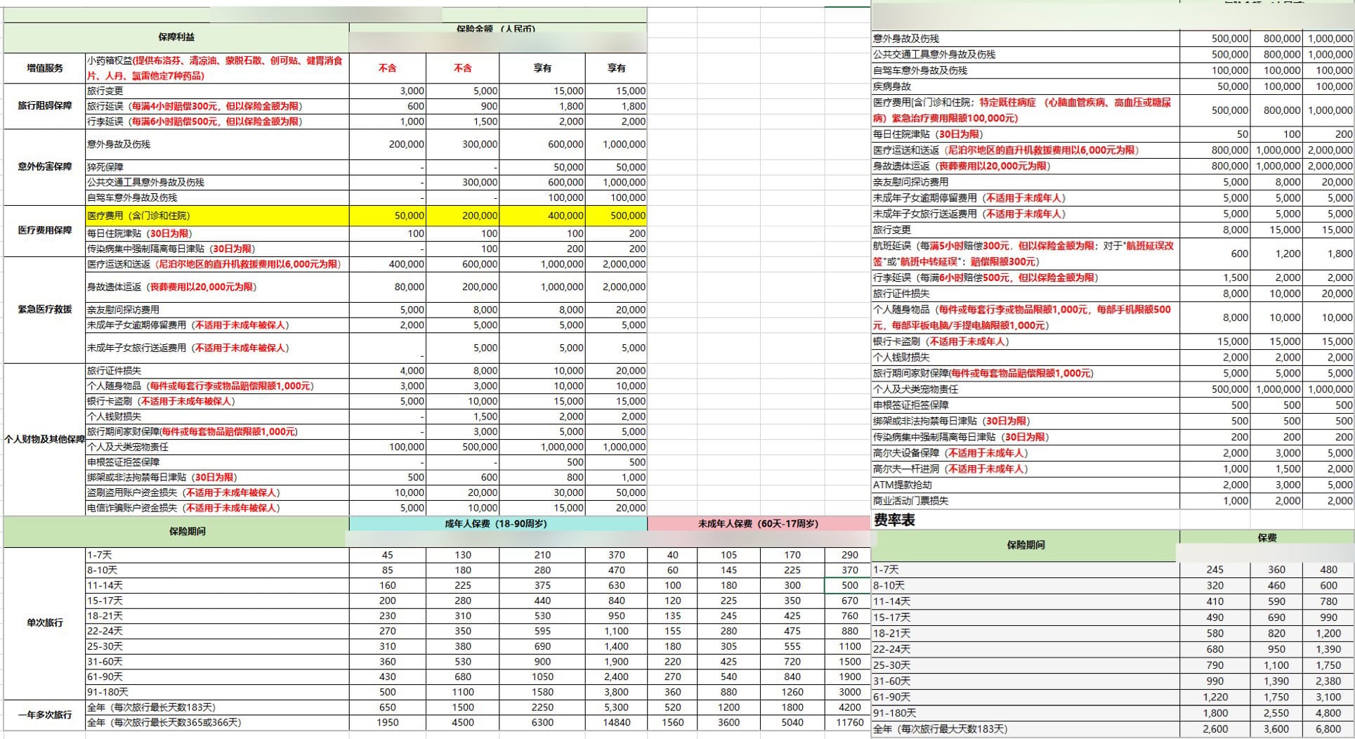 我联系了保险公司的人工客服,同样告知了需求。对方推荐了几套产品套餐,并抛给我两张价格表。这两张表涵盖了复杂的判断维度,我无法直接做决定。