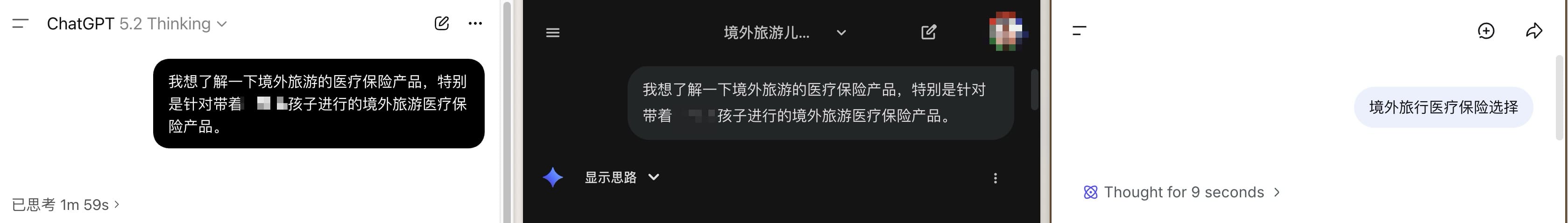近期家人计划一起旅行,还要带一个很小的宝宝,所以医疗保险成了重中之重。我同时用三个 AI 进行对话,说明了目的地、旅行时间、同行人年龄以及我关注的险种。根据 AI 给出的三份回答,我去查看了相关保险公司的官网,最终选定了一家比较适合国人出行的公司。